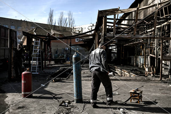 Men repair a workshop of the Palianytsia Volunteer Centre destroyed by a nighttime strike of a Russian Shahed drone on March 8, Zaporizhzhia, Ukraine