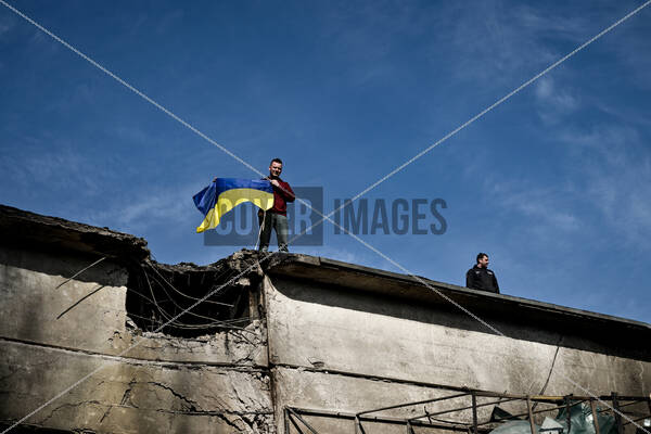 Hennadii Vovchenko, one of the founders of the Palianytsia Volunteer Centre, installs a Ukrainian flag on the roof of a centre’s workshop destroyed by a nighttime strike of a Russian Shahed drone on March 8, Zaporizhzhia, Ukraine