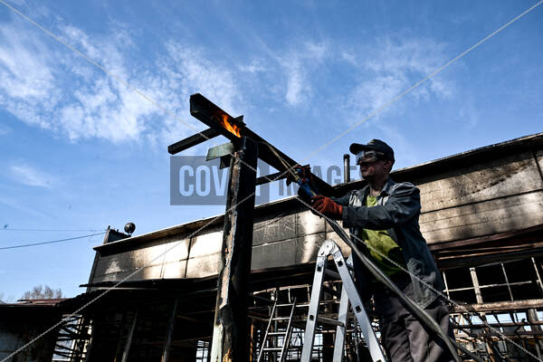 A man cuts out irreparable metal constructions at a workshop of the Palianytsia Volunteer Centre destroyed by a nighttime strike of a Russian Shahed drone on March 8, Zaporizhzhia, Ukraine