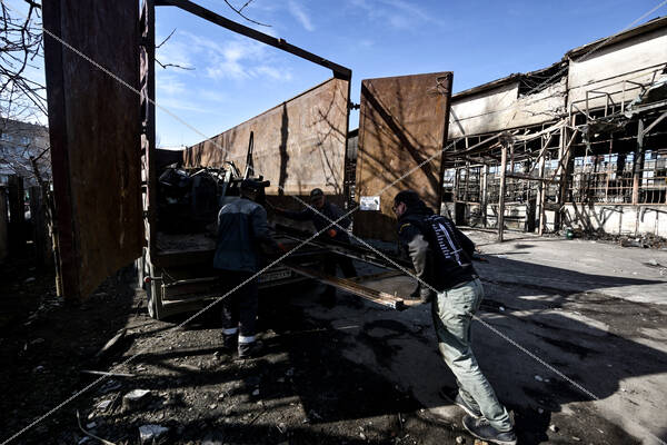 Men load the debris into a truck at a workshop of the Palianytsia Volunteer Centre destroyed by a nighttime strike of a Russian Shahed drone on March 8, Zaporizhzhia, Ukraine