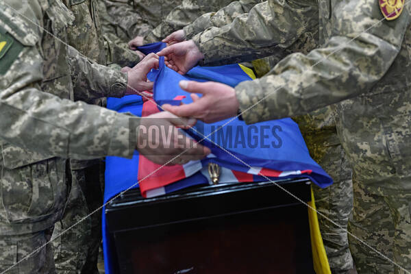 Soldiers fold the flags of Ukraine and New Zealand on the coffin of Dominic Bryce Abelen, a 28-year-old serviceman of Ukraine’s International Legion from New Zealander who died near Vuhledar, Donetsk region, on August 23, 2022, during a memorial ceremony in Kyiv