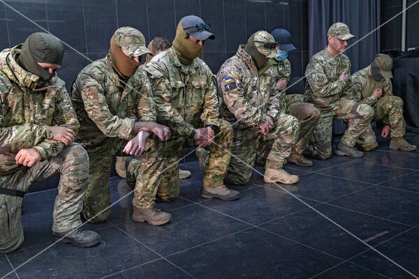 Soldiers kneel during a memorial ceremony for Dominic Bryce Abelen, a 28-year-old serviceman of Ukraine’s International Legion from New Zealander who died near Vuhledar, Donetsk region, on August 23, 2022, in Kyiv