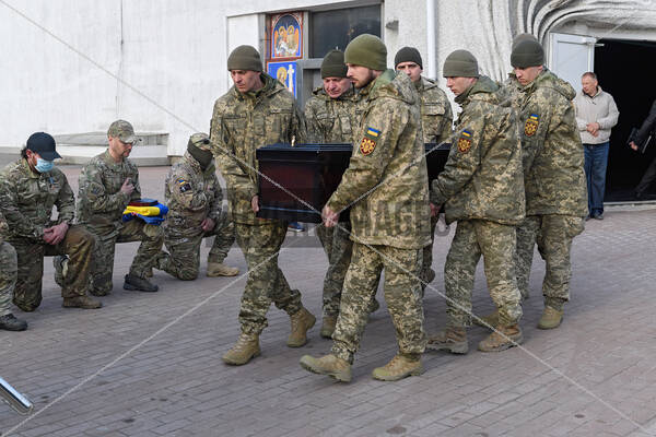 Soldiers carry the coffin of Dominic Bryce Abelen, a 28-year-old serviceman of Ukraine’s International Legion from New Zealander who died near Vuhledar, Donetsk region, on August 23, 2022, during a memorial ceremony at the Baikove Cemetery in Kyiv
