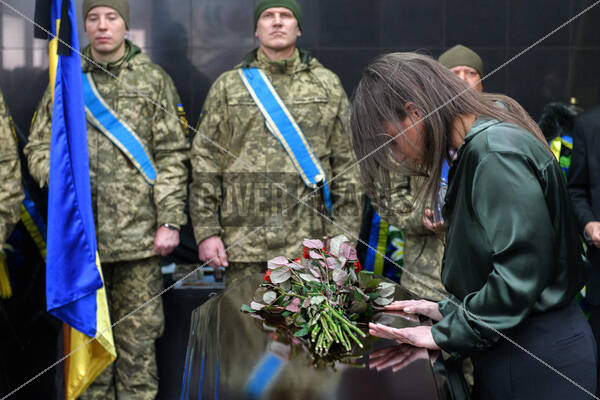 A woman stands at the coffin of Dominic Bryce Abelen, a 28-year-old serviceman of Ukraine’s International Legion from New Zealander who died near Vuhledar, Donetsk region, on August 23, 2022, during a memorial ceremony in Kyiv