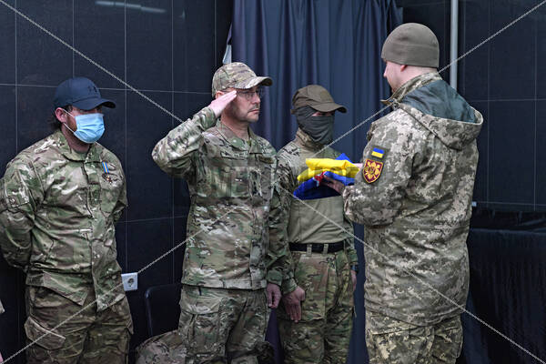 A soldier passes the flags of Ukraine and New Zealand during a memorial ceremony for Dominic Bryce Abelen, a 28-year-old serviceman of Ukraine’s International Legion from New Zealander who died near Vuhledar, Donetsk region, on August 23, 2022, in Kyiv