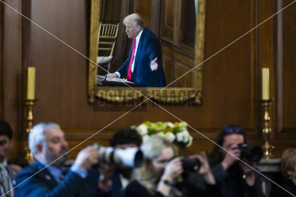 US President Donald Trump is seen in a reflection as he joins the Taoiseach of Ireland Micheal Martin and Speaker of the US House of Representatives Mike Johnson (Republican of Louisiana) at the Friends of Ireland Luncheon at the US Capitol in Washington DC, USA, 12 March 2025. The Irish leader’s visit comes as the EU hit the US with retaliatory tariffs on $28 billion dollars worth of US exports