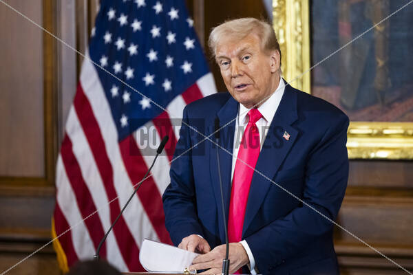 US President Donald Trump joins the Taoiseach of Ireland Micheal Martin and Speaker of the House Mike Johnson at the Friends of Ireland Luncheon at the US Capitol in Washington DC, USA, 12 March 2025. The Irish leader’s visit comes as the EU hit the US with retaliatory tariffs on $28 billion dollars worth of US exports
