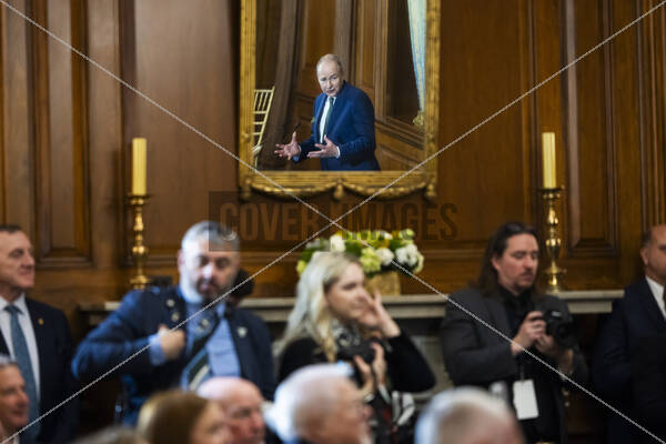 The Taoiseach of Ireland Micheal Martin is seen in a reflection as he joins US President Donald Trump and Speaker of the US House of Representatives Mike Johnson (Republican of Louisiana) at the Friends of Ireland Luncheon at the US Capitol in Washington DC, USA, 12 March 2025. The Irish leader’s visit comes as the EU hit the US with retaliatory tariffs on $28 billion dollars worth of US exports