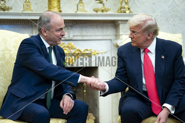 United States President Donald Trump shakes hands with Irish Taoiseach Micheal Martin in the Oval Office of the White House in Washington, DC