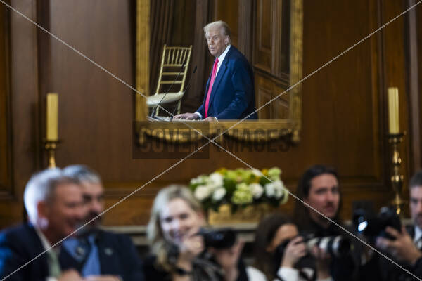 US President Donald Trump is seen in a reflection as he joins the Taoiseach of Ireland Micheal Martin and Speaker of the US House of Representatives Mike Johnson (Republican of Louisiana) at the Friends of Ireland Luncheon at the US Capitol in Washington DC, USA, 12 March 2025. The Irish leader’s visit comes as the EU hit the US with retaliatory tariffs on $28 billion dollars worth of US exports