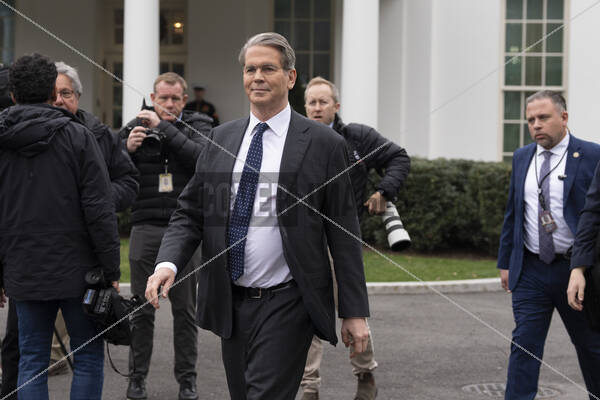 United States Secretary of the Treasury Scott Bessent walks to a television interview at the White House
