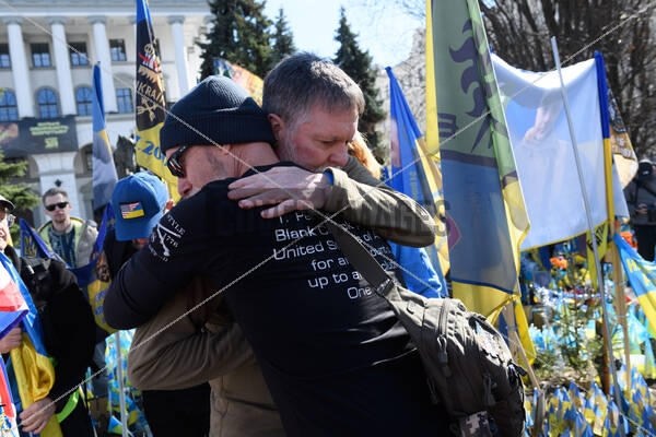 Participants hug each other during the ceremony to honour the memory of the American military volunteers fallen in the Russian-Ukrainian war at the people’s memorial on Maidan Nezalezhnosti Square