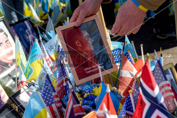 A portrait of an American volunteer fallen in the Russian-Ukrainian war is seen during the commemorative ceremony at the people’s memorial on Maidan Nezalezhnosti Square