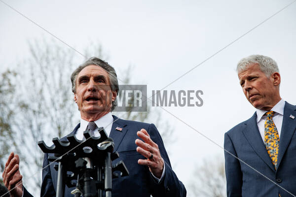 United States Secretary of the Interior and Chair, National Energy Council and White House Energy Czar Doug Burgum (L) speaks to reporters alongside US Secretary of Energy Chris Wright (R) in front of the West Wing at the White House in Washington, D.C. on March 19, 2025. Burgum and Wright met with President Donald Trump and executives from the oil and gas industries at the White House today.