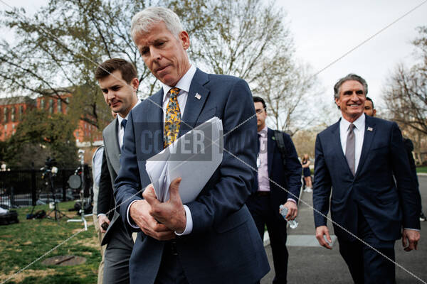 United States Secretary of Energy Chris Wright (L) and US Secretary of the Interior and Chair, National Energy Council and White House Energy Czar Doug Burgum (R) head back into the West Wing after speaking to reporters at the White House in Washington, D.C. on March 19, 2025. Burgum and Wright met with President Donald Trump and executives from the oil and gas industries at the White House today.