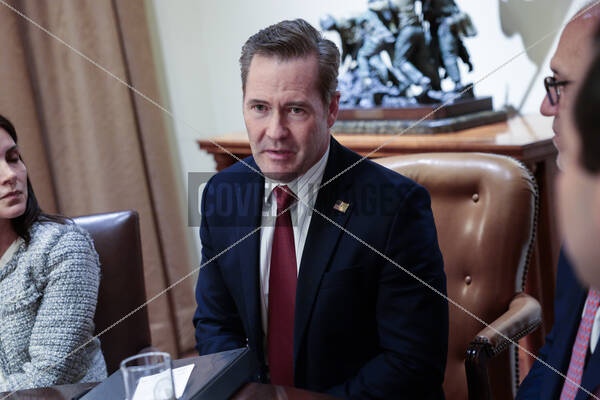National Security Advisor Michael Waltz responds to a question from the news media during a meeting with US President Donald J. Trump and Ambassador nominees in the Cabinet Room of the White House in Washington, DC, USA 25 March 2025. The president took questions that largely concentrated on the controversial Signal text string between the President’s national security staff regarding US attacks in Yemen.