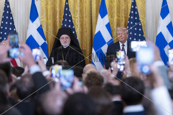 Archbishop Elpidophoros of the Greek Orthodox Archdiocese of America and United States President Donald J Trump participate in a Greek Independence Day Celebration at the White House in Washington, DC