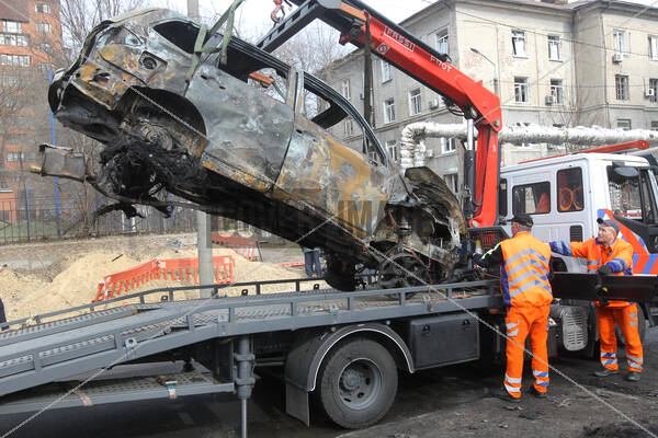 Workers of the Municipal Enterprise “Transport Infrastructure of the City” evacuate cars destroyed by a Russian drone attack