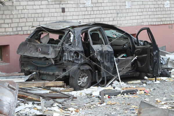 A damaged car is outside an apartment block affected by the fall of a Russian drone in the courtyard, Dnipro, Ukraine