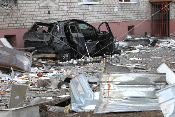 A damaged car is outside an apartment block affected by the fall of a Russian drone in the courtyard, Dnipro, Ukraine