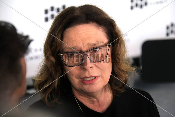 Marshal of the Polish Senate Malgorzata Kidawa-Blonska speaks to the press during a briefing on the sidelines of the Bucha Summit 2025, which marks three years since the liberation of Bucha from Russian occupier