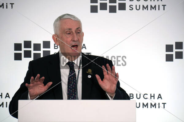 Sir Lindsay Hoyle, the Speaker of the House of Commons of the United Kingdom, holds a briefing on the sidelines of the Bucha Summit 2025, which marks three years since the liberation of Bucha from Russian occupiers, Bucha