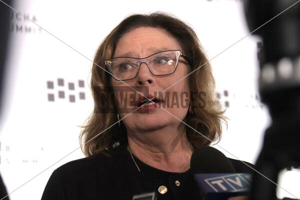 Marshal of the Polish Senate Malgorzata Kidawa-Blonska speaks to the press during a briefing on the sidelines of the Bucha Summit 2025, which marks three years since the liberation of Bucha from Russian occupier