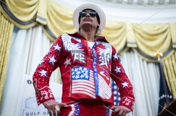 Singer Kid Rock during an executive order signing in the Oval Office of the White House in Washington, DC, US, on Monday, March 31, 2025. The order directs the Federal Trade Commission to work with the Department of Justice to ensure that competition laws are enforced in the concert and entertainment industry, and pushes state consumer protection authorities on enforcement.