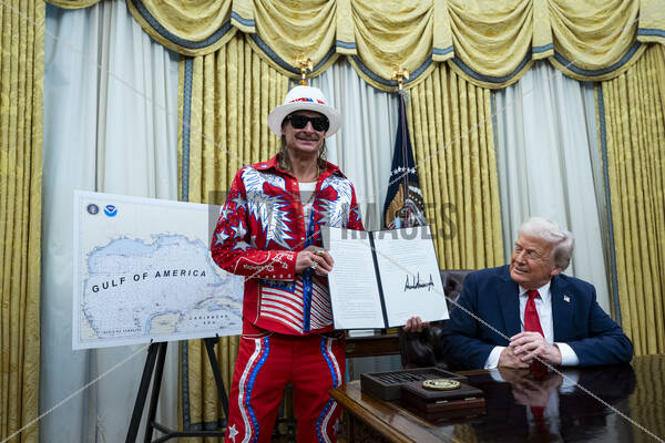 Singer Kid Rock, left, and US President Donald Trump during an executive order signing in the Oval Office of the White House in Washington, DC, US, on Monday, March 31, 2025. The order directs the Federal Trade Commission to work with the Department of Justice to ensure that competition laws are enforced in the concert and entertainment industry, and pushes state consumer protection authorities on enforcement.