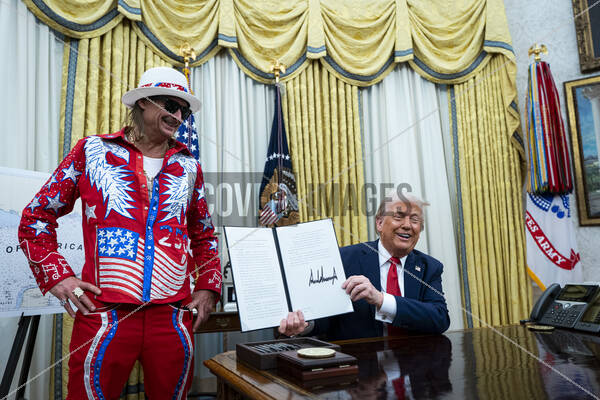 Singer Kid Rock, left, and US President Donald Trump during an executive order signing in the Oval Office of the White House in Washington, DC, US, on Monday, March 31, 2025. The order directs the Federal Trade Commission to work with the Department of Justice to ensure that competition laws are enforced in the concert and entertainment industry, and pushes state consumer protection authorities on enforcement.