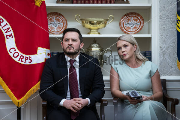Taylor Budowich, White House deputy chief of staff, left, and Karoline Leavitt, White House press secretary, during an executive order signing in the Oval Office of the White House in Washington, DC, US, on Monday, March 31, 2025. The order directs the Federal Trade Commission to work with the Department of Justice to ensure that competition laws are enforced in the concert and entertainment industry, and pushes state consumer protection authorities on enforcement.