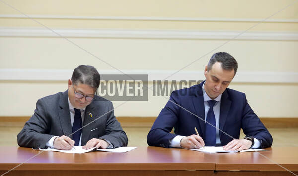 Special Envoy of the President of France for Economic Assistance and Reconstruction of Ukraine Pierre Elbrun and Minister of Health of Ukraine Viktor Liashko (L to R) are pictured during the signing of agreements to be implemented as part of the French government’s assistance in the reconstruction of Ukraine