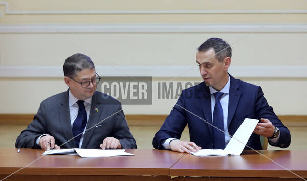 Special Envoy of the President of France for Economic Assistance and Reconstruction of Ukraine Pierre Elbrun and Minister of Health of Ukraine Viktor Liashko (L to R) are pictured during the signing of agreements to be implemented as part of the French government’s assistance in the reconstruction of Ukraine