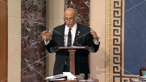 In this image from United States Senate television, United States Senator Cory Booker (Democrat of New Jersey) speaks during a marathon address from the floor in the US Senate