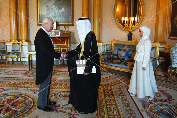 PersonInImage: The ambassador of Kuwait, Bader Almunayekh, presents his credentials to King Charles III accompanied by Manal Almahmeed