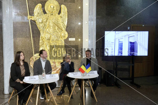 PersonInImage: Olha Korol, the project manager at the Favbet Foundation, Charles Kaisin, a Belgian designer, Marie-France Botte, the head of international relations at the mayor’s office of Brussels responsible for economic liaisons and patronage, and Serhii Anzhyiak, the director of the Culture Department at the Kyiv City State Administration, (L to R)