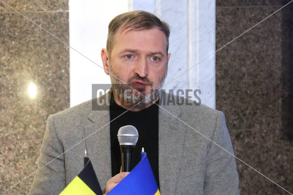 Serhii Anzhyiak, the director of the Culture Department at the Kyiv City State Administration, attends a news conference on the Origami for Ukraine charity project at the Museum of the History of Kyiv