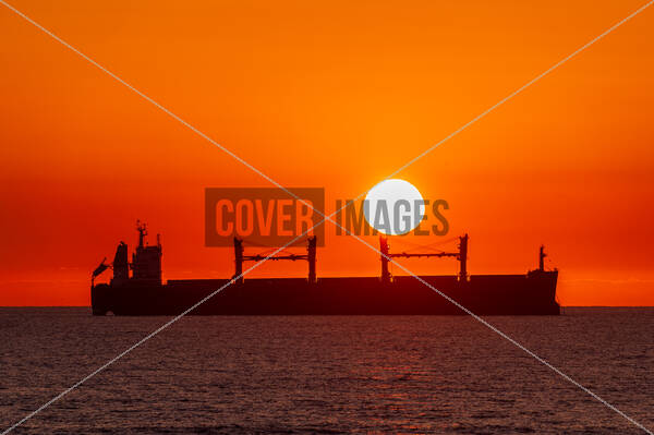A vibrant red sunrise casts its glow over the Bulk Carrier Issara Naree at the Port of Tyne in South Shields