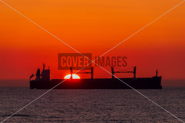 A vibrant red sunrise casts its glow over the Bulk Carrier Issara Naree at the Port of Tyne in South Shields