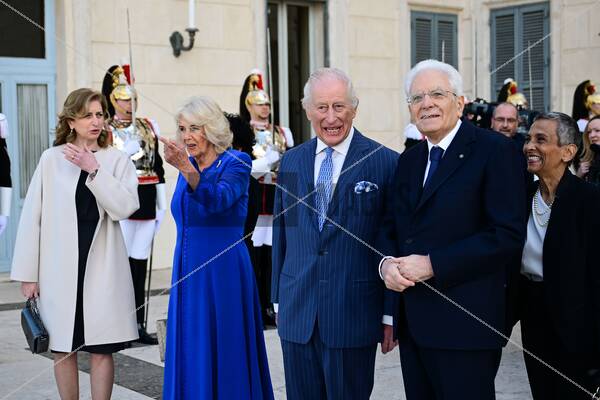 King Charles III and Queen Camilla are received by the President of the Italian Republic, Sergio Mattarella and the President's daughter, Laura Mattarella as they arrive for their visit to Quirinale Palace, in Rome, on the second day of their four day state visit to Italy.