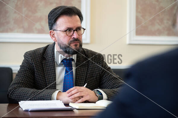 Deputy Minister of Culture and Strategic Communications of Ukraine for European Integration Andrii Nadzhos is seen during the meeting with OSCE High Commissioner on National Minorities Christophe Kamp