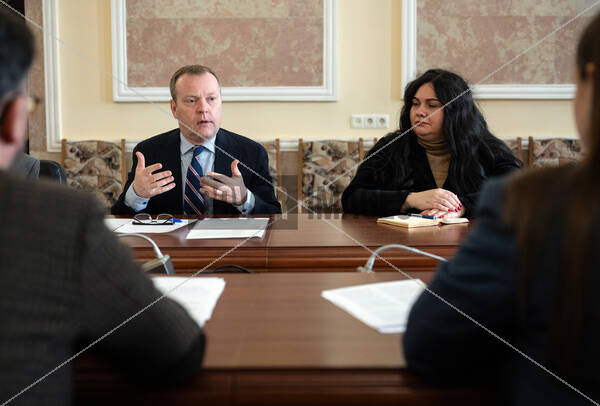 OSCE High Commissioner on National Minorities Christophe Kamp is seen during the meeting with Deputy Minister of Culture and Strategic Communications of Ukraine for European Integration Andrii Nadzhos