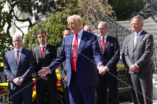 United States President Donald J Trump participates in a Photo Opportunity with Racing Champions on the South Lawn of the White House in Washington, DC on Wednesday, April 9, 2025. Cars from NASCAR, IndyCar and IMSA are parking in front of the South Portico