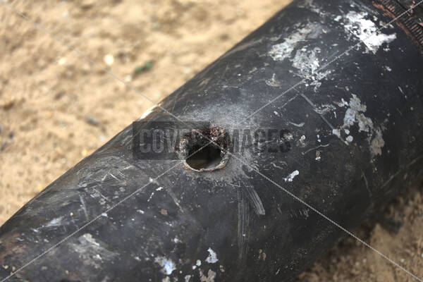 A defused Russian shell is shown to journalists after its detonation with the help of the Spalakh modular cumulative demining system during tests at one of the training grounds in the Kharkiv direction, Kharkiv region