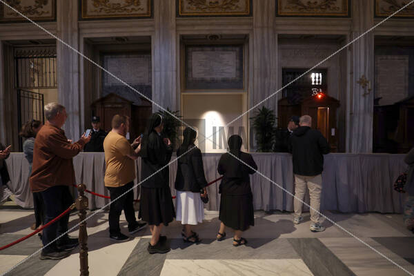 Pilgrims and faithful pay homage to the tomb of Pope Francis Bergoglio at the Basilica of Santa Maria Maggiore where he is buried.
