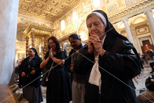 Nuns pray the rosary in front of the tomb. Pilgrims and faithful pay homage to the tomb of Pope Francis Bergoglio at the Basilica of Santa Maria Maggiore where he is buried.