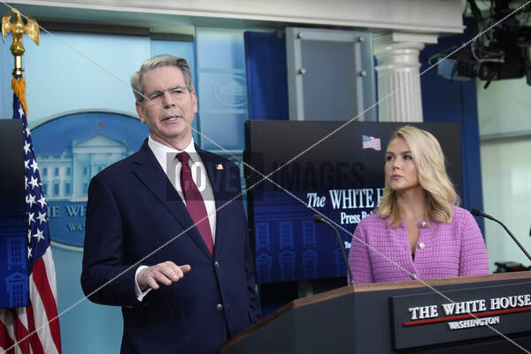 United States Secretary of the Treasury Scott Bessent and White House Press Secretary Karoline Leavitt hold a press briefing in the James S Brady Press Briefing Room of the White House in Washington, DC