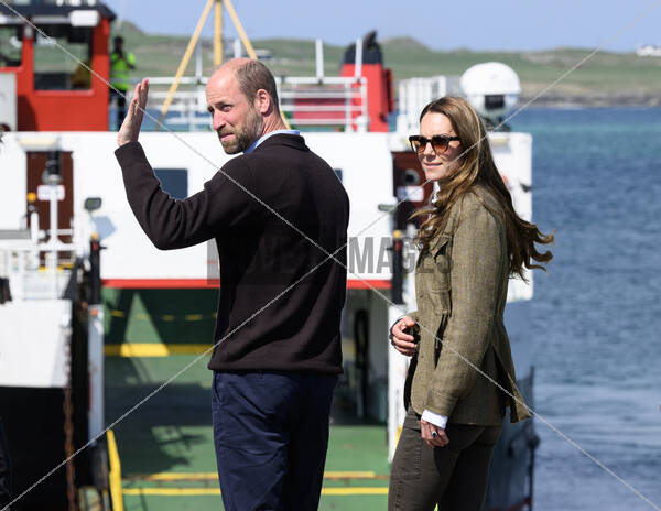 The Prince and Princess of Wales, known as the Duke and Duchess of Rothesay when in Scotland, meeting those who run the public ferry service as well as members of the community who use it before taking the ferry across the water to the Isle of Iona, on the last day of the royal visit to the Isle of Mull.