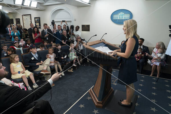 White House Press Secretary Karoline Leavitt conducts a press briefing for a Take Our Sons and Daughters to Work Day event in the James S Brady Press Briefing Room of the White House in Washington, DC