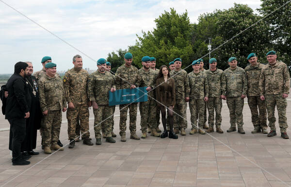 PersonInImage: Kyiv City Military Administration head Tymur Tkachenko, former POW, chaplain Vasyl Vyrozub (L to R), head of the Cultural Forces platform Mykolai Sierga (4th L), Chief of the General Staff of the Armed Forces of Ukraine, Major General Andrii Hnatov (5th L) and singer Khrystyna Soloviy